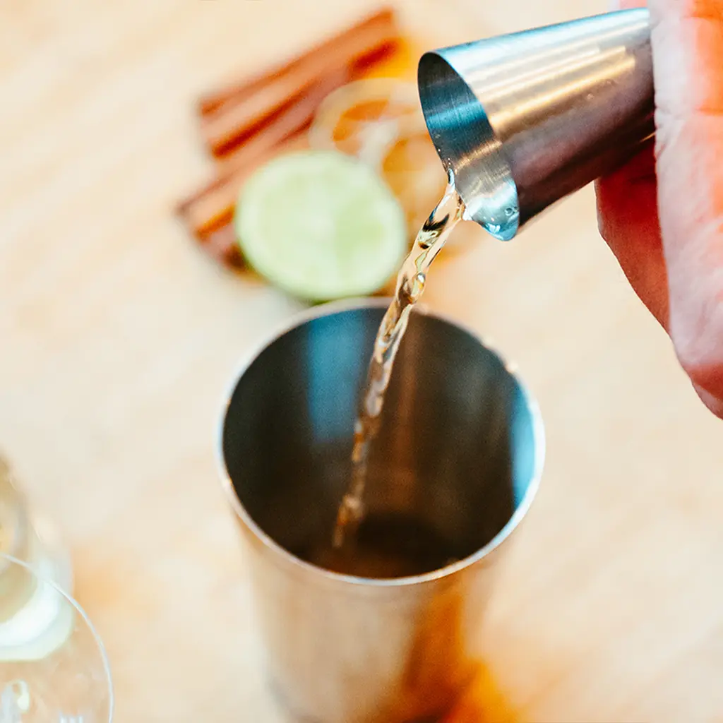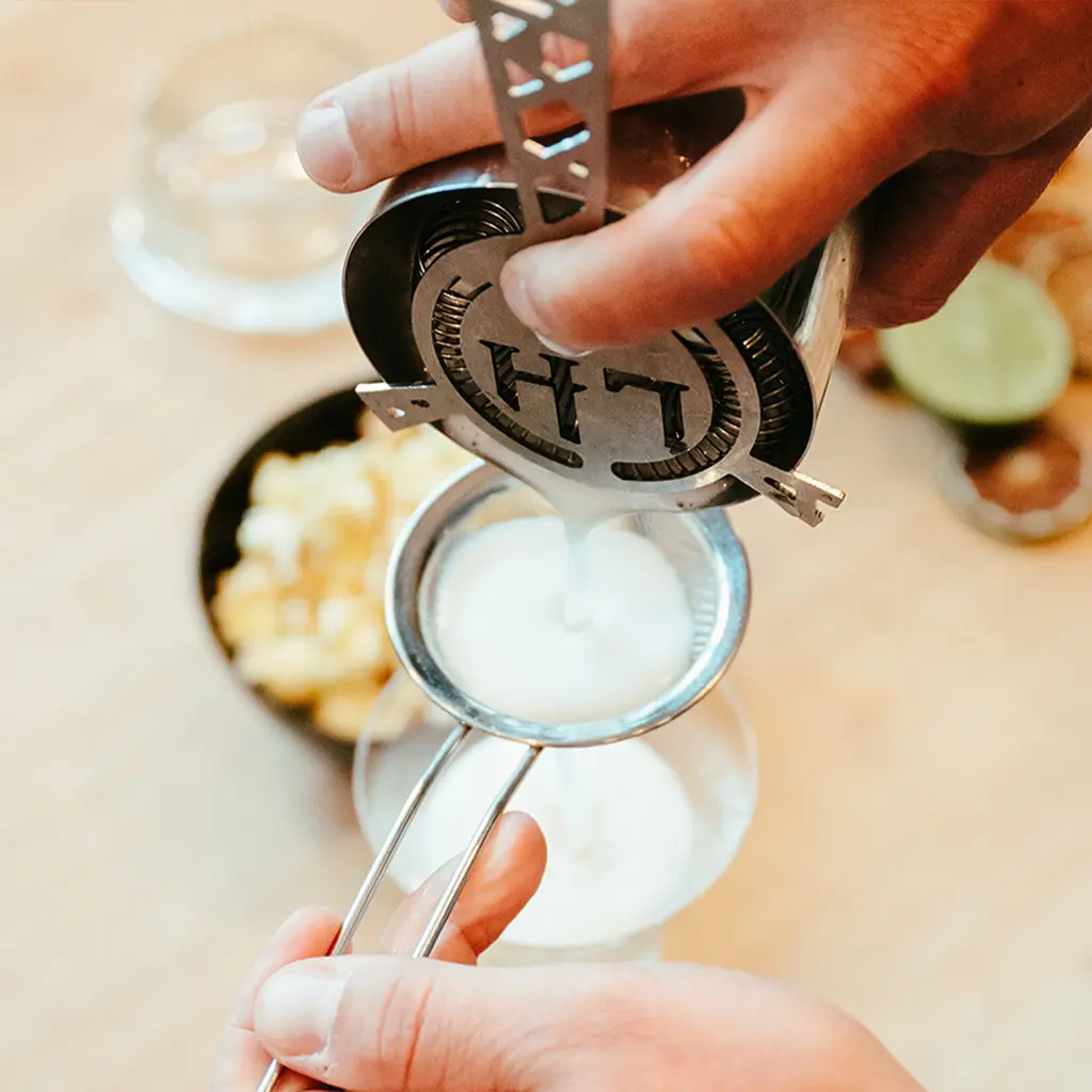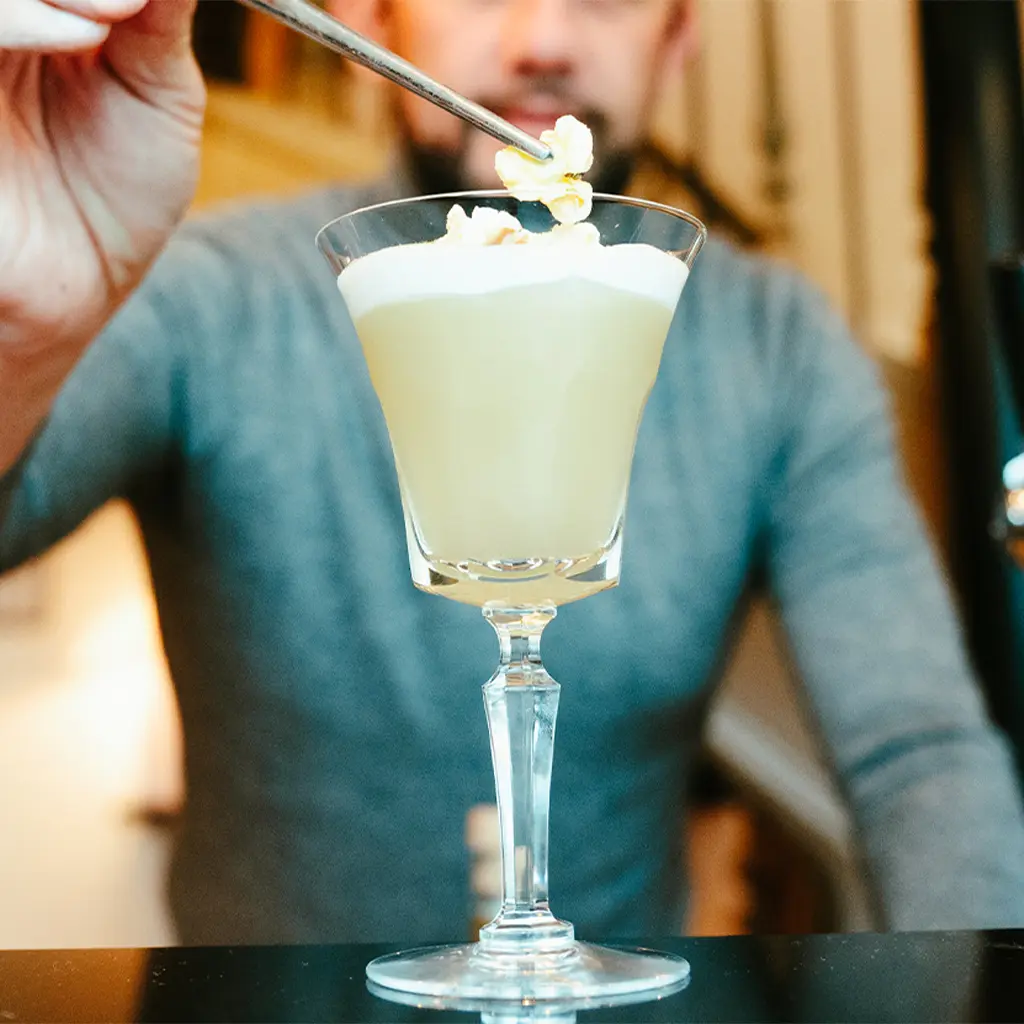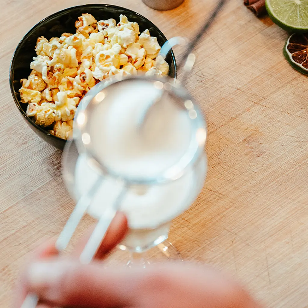 - Versez les différents ingrédients PVREZERO Alternative to Amaretto, jus de citron, blanc d’oeuf et sirop de popcorn ;